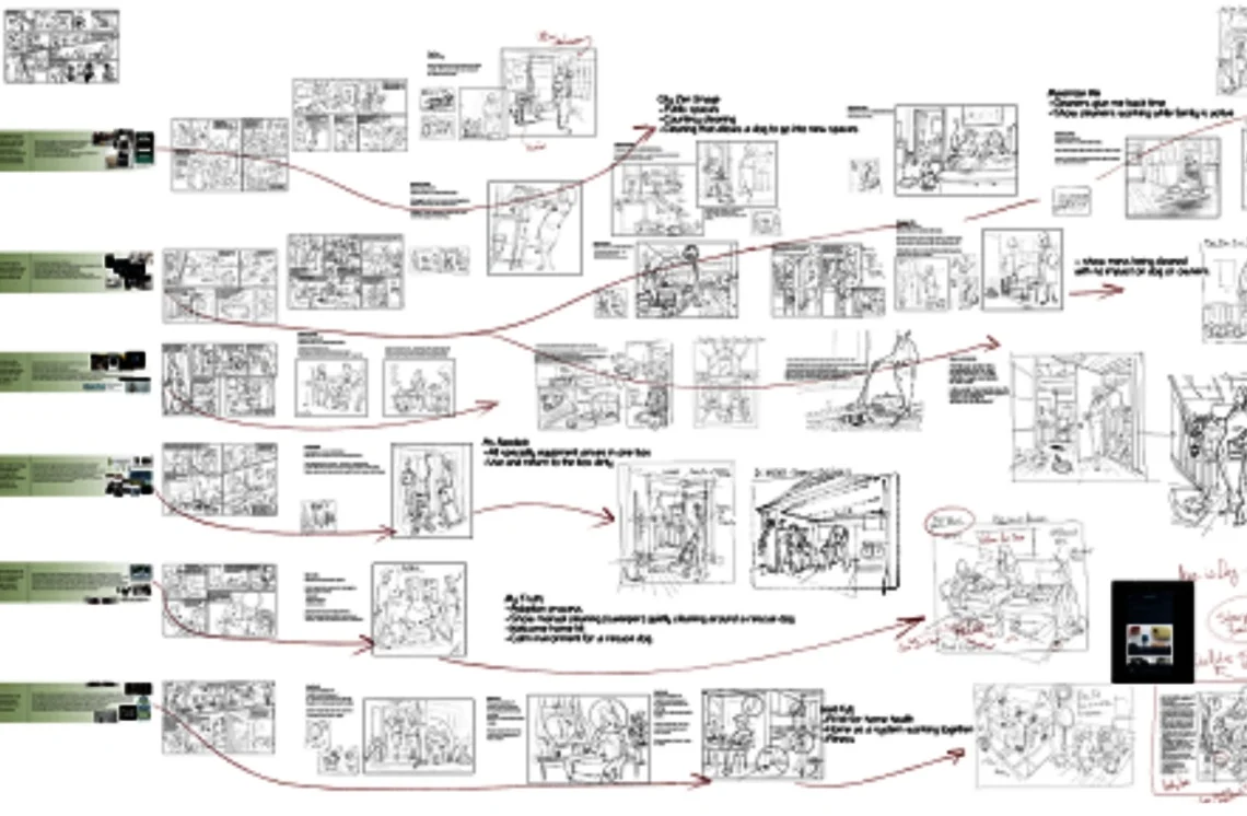 An iterative process of thumbnails and rough concepts to review and refine into key images or sequences that capture the most essential design attributes.